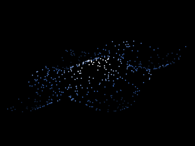 This model maps turtles between Cartesian and spherical 3-dimensional coordinates. To create the appearance of a curved 3D surface, the program generates turtles with random x- and z-coordinates, then computes each turtle's y-coordinate based on x and z, and time. The cosine function is used in the formula to produce a curved surface. Varying the y coordinate based on time produces motion.