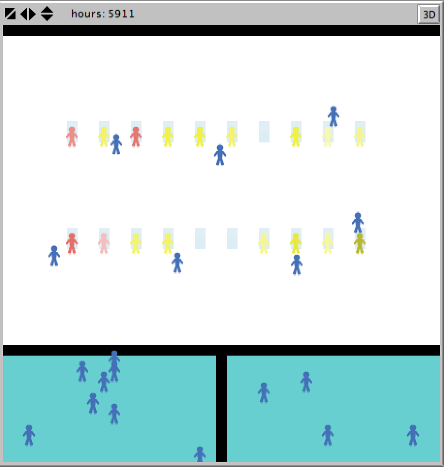 Also notice how the caregivers move to the cyan rooms on the bottom of the world. This is to help visualize how caregivers move in and out of treating their patients. This could be very interesting if the model extended into geospatial constraints. It also helps to visualize how changing the care-time % can change where the care givers are located.