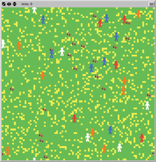 This model attempts to replicate hunter-gatherer tribal dynamics of the Paleolithic era. One or two tribes compete for resources--rabbits (for hunters) and edible plants (for gatherers)--and when those resources die out, so do the tribe(s). Rabbits are also in competition with the tribes to consume the edible plants. The tribes reproduce, but only if their energy is sufficient. If they are 'starving', they will not reproduce, in an effort to stay as close to reality as possible.