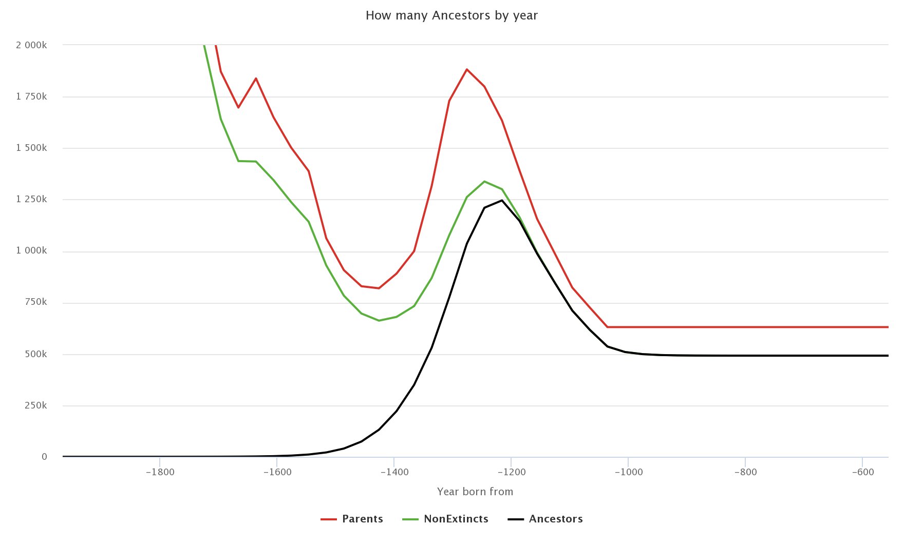 We also estimate all non-extinct parents in each generation, i.e. all those who have at least one descendant in E&W today. We call these the NonExtincts and calculate them using a similar formula for the # distinct random picks, as follows: