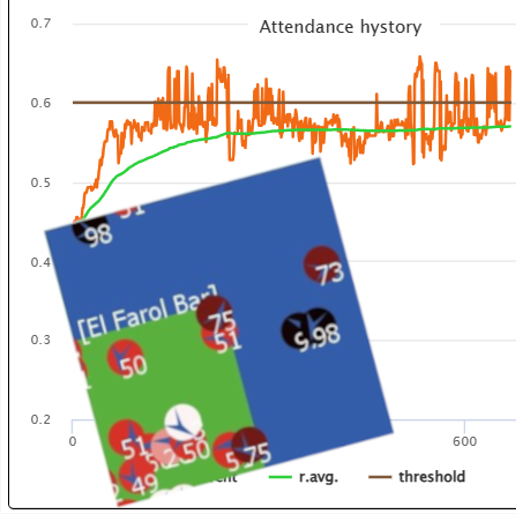 • ATTENDANCE HISTORY displays the value of the threshold (brown line), the mean fraction of flibs attending the bar (orange line) and its running average (green line) over time (ticks).
