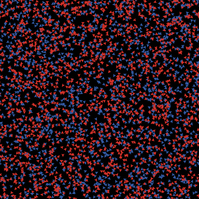 To setup, all variables and agents are cleared, and then the square space is filled with blue agent and red agents. To go, in random order, each agent kills exactly one enemy, if an enemy remains to kill.